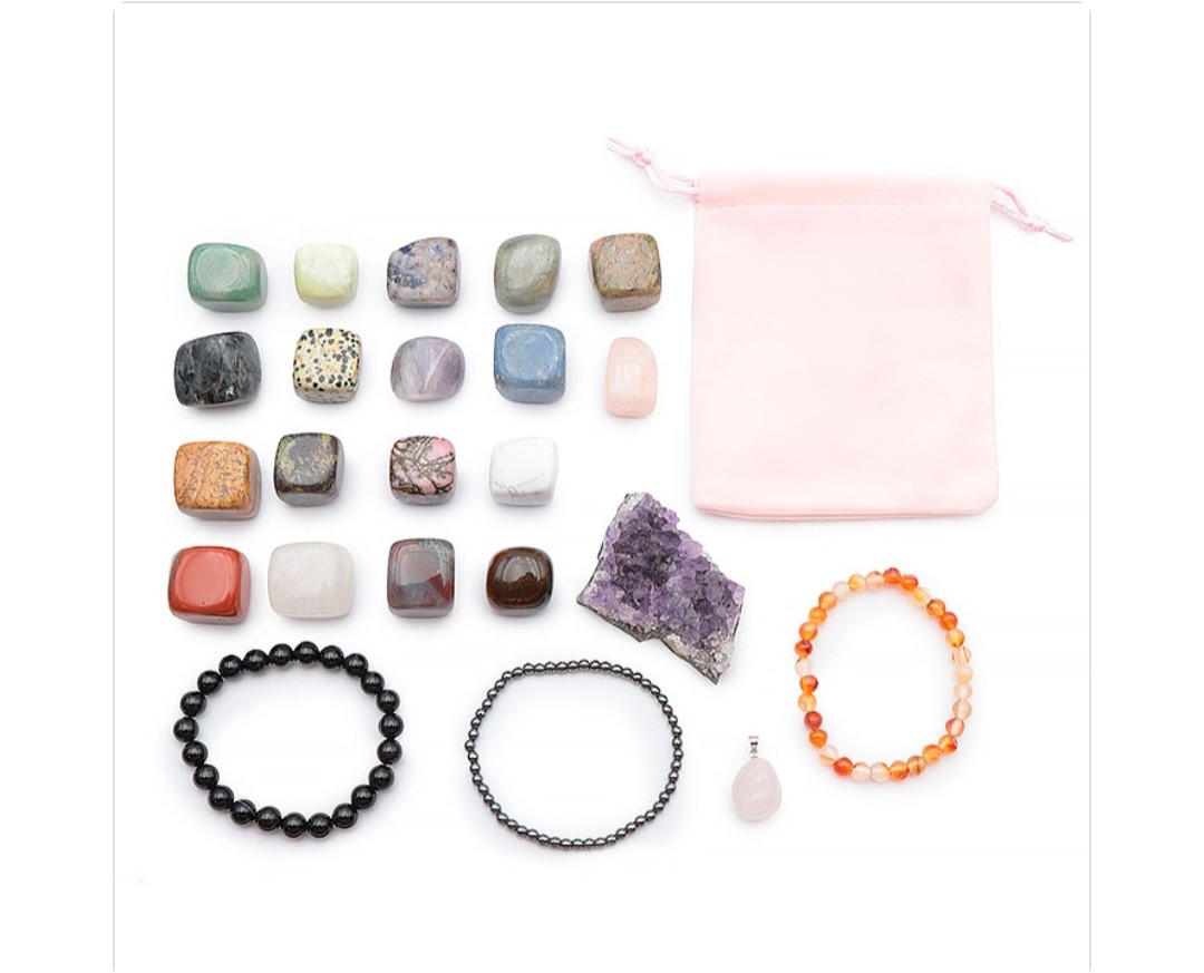 1. Pierre Roulée Oeil de Tigre 2. Pendentif Pierre Roulée Quartz Rose 3. Pierre Roulée Rhodonite 4. Pierre Roulée Aventurine Verte 5. Pierre Roulée Quartz Rose 6. Bracelet Boule 04mm Hématite 7. Pochette Feutrine rose 8. Pierre Roulée Agate Indienne 9. Pierre Roulée Unakite 10. Pierre Roulée Jaspe Rouge 11. Pierre Roulée Jaspe Sang de Dragon 12. Pierre Roulée Larvikite 13. Bracelet Boule 06mm Cornaline 14. Pierre Roulée Jaspe Dalmatien 15. Pierre Roulée Jaspe Paysage 16. Pierre Roulée Aventurine Bleue 17. Pierre Roulée Howlite Blanche 18. Pierre Roulée Cristal de Roche 19. Pierre Roulée Jade de Chine 20. Bracelet Boule 08mm Onyx 21. Pierre Roulée Labradorite 22. Pierre Roulée Améthyste 23. Pierre Roulée Sodalite 24. Mini Druse Améthyste